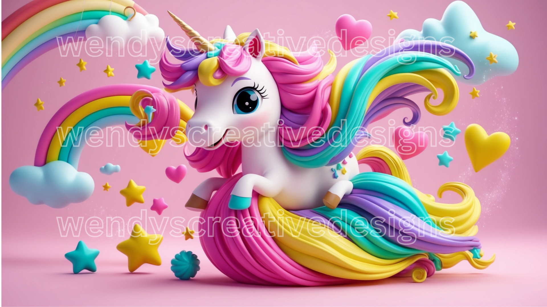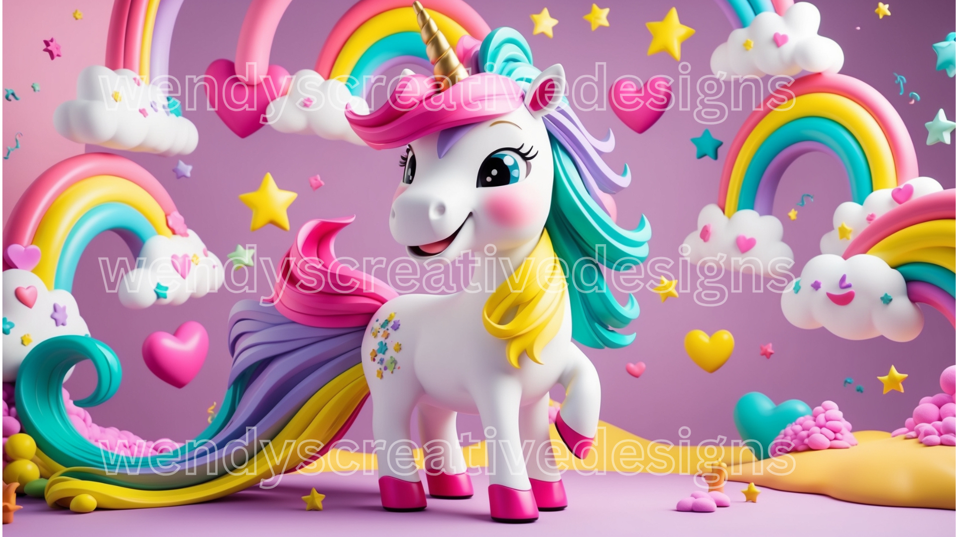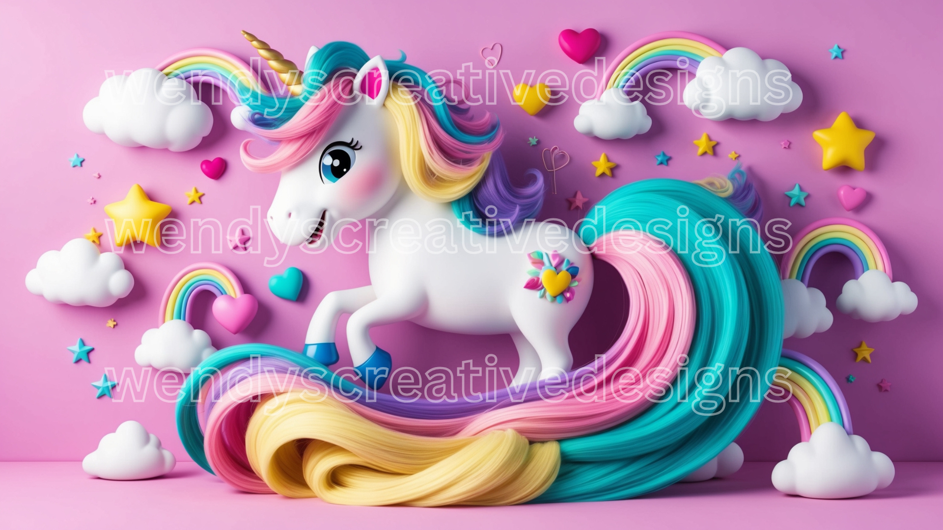 4 A vibrant and whimsical 3D unicorn design featuring a cute, cartoon-style unicorn with a flowing, multicolored mane